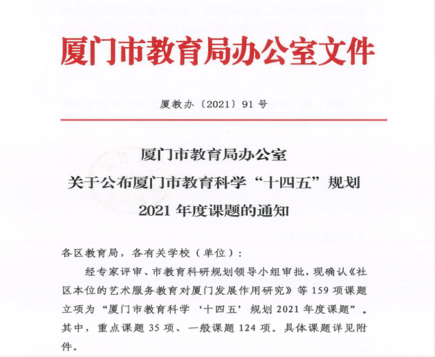 为贯彻落实《教育部关于加强新时代教育科学研究工作的意见》和全国教育科研工作会议精神,进一步繁荣和发展厦门市教育科学研究事业,推进教育科研高质量发展,促进优秀教育科研成果转化、应用与推广,厦门市教育科学研究规划领导小组办公室组织了“厦门市教育科学‘十四五’规划2021年度课题”立项工作。